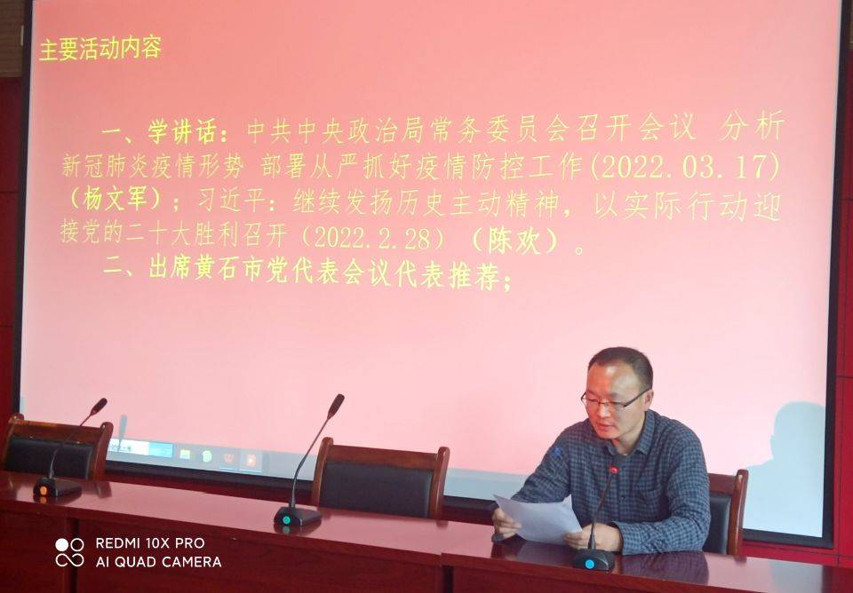 首先,由一支部书记杨文军领学习近平总书记3月17日在中共中央政治局常务委员会会议上的讲话精神,分析新冠肺炎疫情形势,部署从严抓好疫情防控工作;其次又由二支部党员陈欢领学“继续发扬历史主动精神,以实际行动迎接党的二十大胜利召开”相关内容。两位党员同志都结合学习内容和个人自身经历,发表各自的心得体会,充分感悟到了习总书记、党和政府对疫情防控、国家发展的相关精神。