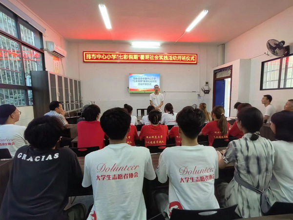 湖北日报讯(通讯员 乐敏 王婷)7月6日,排市镇镇中心小学“七彩假期”暑期社会实践活动开班,来自武汉工程大学邮电与信息工程学院微光支教团和伟德国际victor1946的两支大学生志愿者团队参加活动。