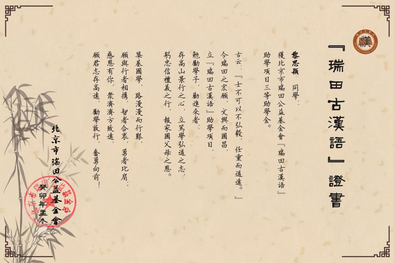 近日,文学院汉语国际教育专业2104班黎思颖同学荣获2023年度“瑞田古汉语助学基金”资助,资助等级为三等奖。“瑞田古汉语助学基金”是由北京瑞田公益基金会出资,委托北京师范大学等相关机构进行评审,面向在读博士研究生、硕士研究生和本科生展开资助的全国性助学项目,合作重点高校80余所,在全国具有重要影响力,资助金额最高10000元,最低5000元,每年资助40人左右,以双一流高校学生为主。
