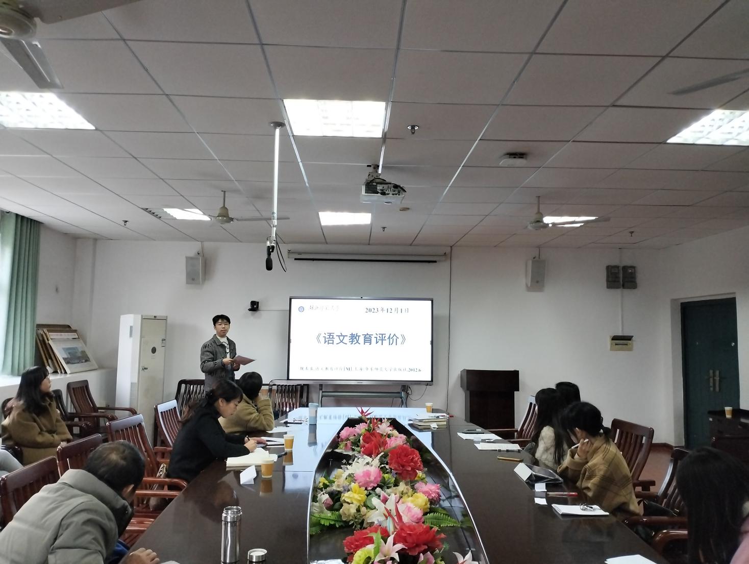 会议伊始,彭江浩指出此次研究生学术交流活动的重要性和必要性,希望研究生们认真对待, 提升自身的论文写作能力,并对报告会程序进行了说明。随后,各位同学依次进行汇报。程倩同学分享了自己阅读《温儒敏论语文教育三集》的感受,她认为作者善于从多角度思考、研究语文,注重培养学生对语文学习的兴趣。张小丽同学聚焦于苏霍姆林斯基的著作《给教师的一百条建议》中所提到的教师职业特点、智育的主要任务及其实施、教师应具备的素养等方面,论述其实用价值。赵淑雅同学围绕分析课堂学情、创新课堂教学模式、处理课堂节奏等实际问展开对《美其所美——王崧舟讲语文课怎么上》一书的讨论,其间引用了许多生动的案例。吴燕婷同学运用思维导图的形式,重点从教学目标的编写和教学的切入点两方面分享《语文教学设计:优化与重构》的读后心得。 赵乐美同学立足当前高中古诗词教学现状,提出微课与高中古诗词融合教学的相关策略。宋玉洁同学从项目式学习的含义、构成要素、操作程序、设计框架入手,并结合案例对这一理念展开详细分析。彭扬同学从宏观、中观、微观层面梳理《语文教育评价》的内容,对语文教育评价三大范式的优缺点作了讲解。刘伶燕同学重点论证了ChatGPT之于写作教学的“能”和“不能”。