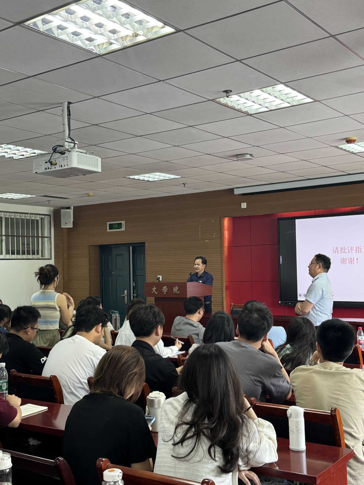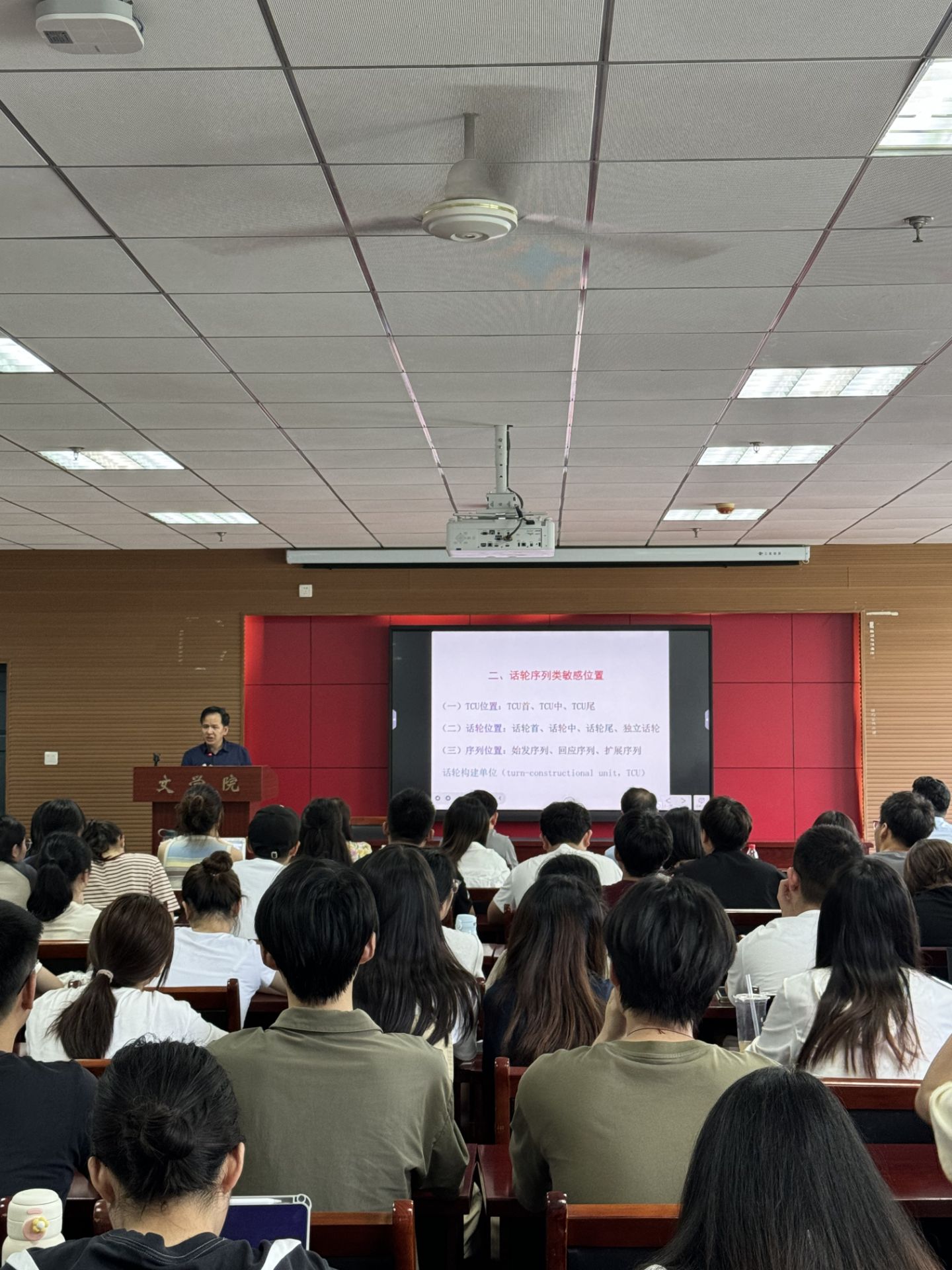 学术报告题为《位置敏感语法的三类主要敏感位置》。报告开始,他以词序在语言中的重要作用为导入,引出“语言研究中,位置是一个重要因素”的重要观点,由此进入此次学术报告的主要内容。在报告过程中,姚双云教授首先为大家介绍了一些国内外关于位置敏感语法的研究现状并在此基础上提出了一些问题以及他对这些问题的看法。他介绍了语言中三类敏感位置,即“话轮序列类敏感位置”、“身体活动类敏感位置”、“行动进程类敏感位置”,并且详细分析了不同敏感位置下的具体小类,在讲述这些理论性观点的同时,姚双云教授还结合丰富且富有生活气息的语料,使理论更加通俗易懂。最后,姚双云教授进行总结,说明了位置敏感语法与多模态语法之间的重要关系,并且展望了这一研究的前景。报告结束后,姚双云教授与师生们进行了深度的互动交流。