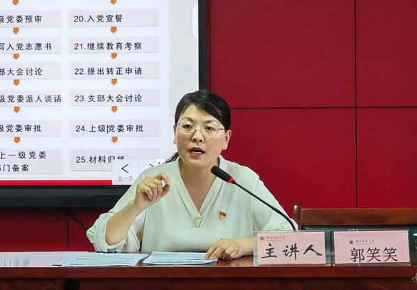课上,郭笑笑主要从申请入党、入党积极分子的确定和培养教育、发展对象的确定和考察、预备党员的接收、预备党员的教育考察和转正五大环节向学员们介绍发展党员的工作流程。每一大环节都有不同的小步骤和注意事项,需要严格按照规定进行操作,确保每一步骤的规范性和严谨性。郭笑笑强调,发展党员工作是党的建设工作中的一项重要任务,他关系到党的生机与活力,关系到党的事业后继有人,因此要认真对待每一个环节,确保党员发展工作的顺利进行。她希望全体学员认真对待党员发展工作,为党的事业贡献自己的力量,为实现中华民族伟大复兴的中国梦挺膺担当、不懈奋斗!