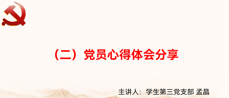 分享学习体会环节,学生党员胡媛同志谈到,要树立远大理想,坚定对马克思主义、社会主义和共产主义的信仰,积极学习红色历史,回顾建军历程,勇于担当、勤于实践,以实际行动弘扬中国革命文化。学生党员孟晶同志谈到,作为新时代青年党员,要坚定理想信念、厚植爱国情怀,树牢全心全意为人民服务的宗旨意识和不屈不挠的斗争意志,将个人的理想追求融入到党和国家、民族的事业中去。