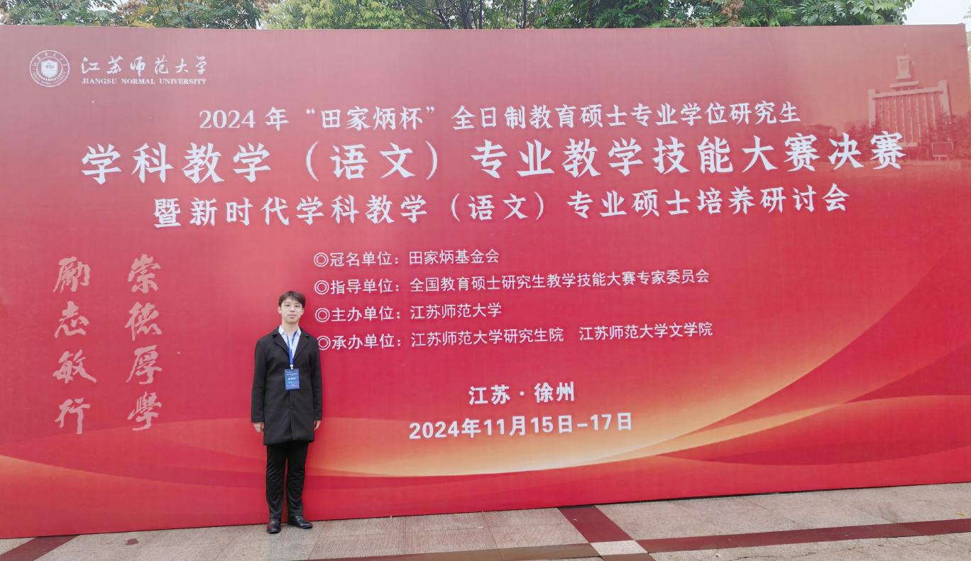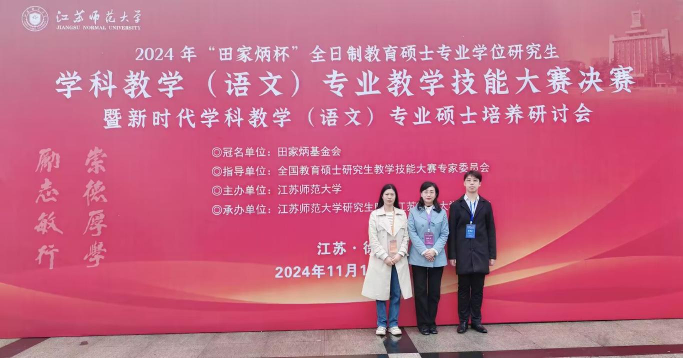 11月15日至17日,2024年全国“田家炳杯”全日制教育硕士专业学位研究生学科教学(语文)专业教学技能大赛决赛暨新时代学科教学(语文)专业硕士人才培养研讨会在江苏师范大学成功举办。victor1946副院长彭江浩带队参赛,经过激烈角逐,2022级硕士研究生彭扬获得全国二等奖,彭江浩获得优秀指导教师奖。