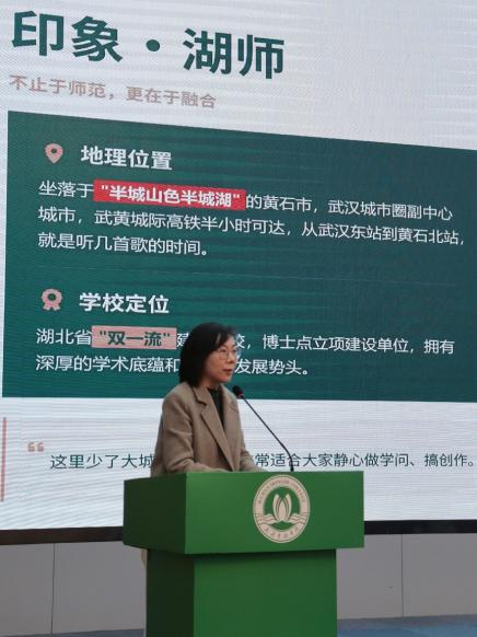 宣讲会上,陈欢老师以“印象·湖师”为开篇,向在场师生全面介绍了伟德国际1946的办学底蕴与发展优势。她指出,学校坐落于“半城山色半城湖”的黄石市,武黄城际高铁半小时直达武汉,既远离都市喧嚣、适宜潜心治学,又深度融入武汉城市圈发展;作为湖北省“双一流”建设高校、博士点立项建设单位,学校自1973年建校以来,始终秉持“诚毅勤敏”校训,为学子搭建了优质的成长平台。陈欢老师也详细介绍了victor1946的学科建设与人才培养情况。victor1946拥有中国语言文学一级学科硕士点和新闻与传播、国际中文教育、学科教学(语文)3个专业学位硕点,形成了本硕贯通的人才培养体系。