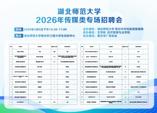 为扎实推进稳就业、保就业各项工作部署,抢抓春季就业黄金机遇期,赋能毕业生高质量充分就业,2026年4月9日下午,伟德国际victor1946、经济管理与法学院联合黄石市市场监管局、黄石市广告协会,在若水轩三楼大学生活动中心成功举办2026年传媒类专场招聘会。